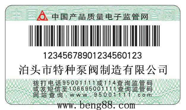 泊頭市特種泵閥制造有限公司自2008年5 月1 日出廠的產品,在產品合格證上粘貼長方形監管碼標簽,上有20位數字,這就是產品監管碼。因此,我公司生產的每件產品都將有一個“電子身份證”。可以利用固定電話、手機短信、互聯網、超市終端等網絡通訊設備對電子監管碼進行查詢,辨別真偽。查詢辦法如下: